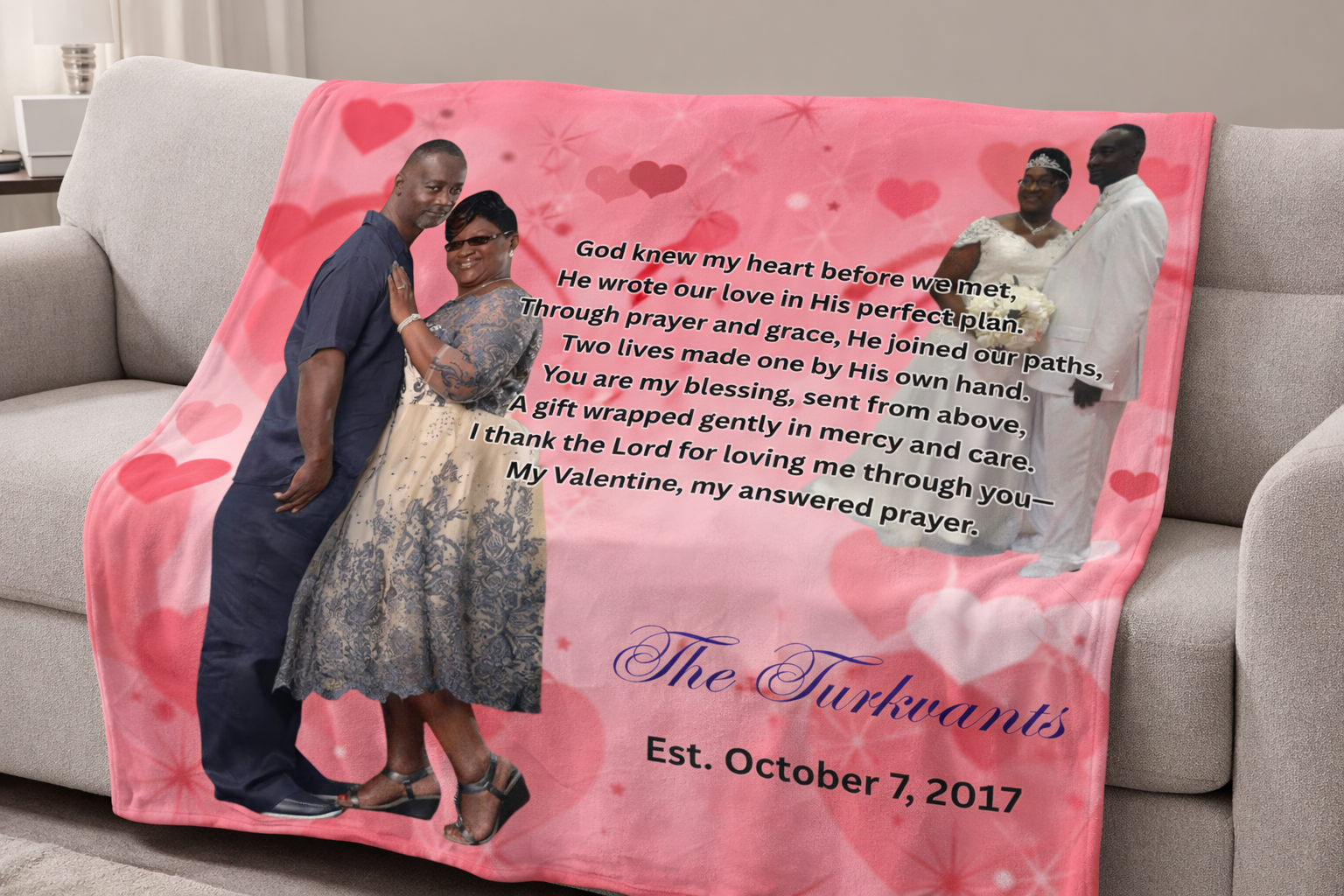 Celebrate love with a personalized Valentine blanket that transforms your cherished memories into a cozy keepsake. Upload your favorite photo to create a one-of-a-kind blanket that captures the moments you treasure most. Perfect for snuggling together, gifting to someone special, or adding a heartfelt touch to any room. This customized blanket combines comfort with sentimentality, making it an ideal Valentine's Day present that goes beyond the ordinary. High-quality materials ensure durability and softness for years of warmth and cherished memories.